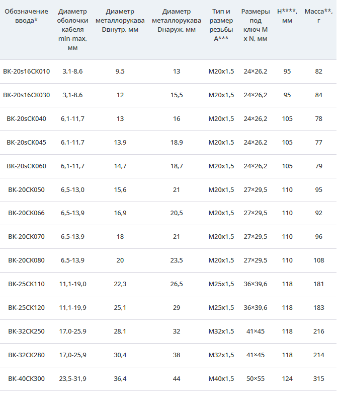 Таблица выбора кабельного ввода серии ВК-СК. Габаритные размеры