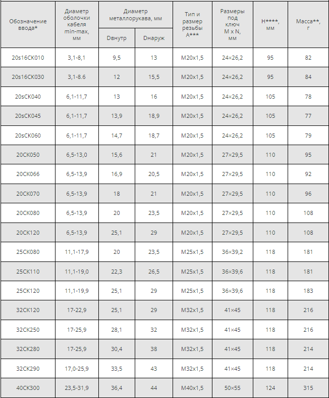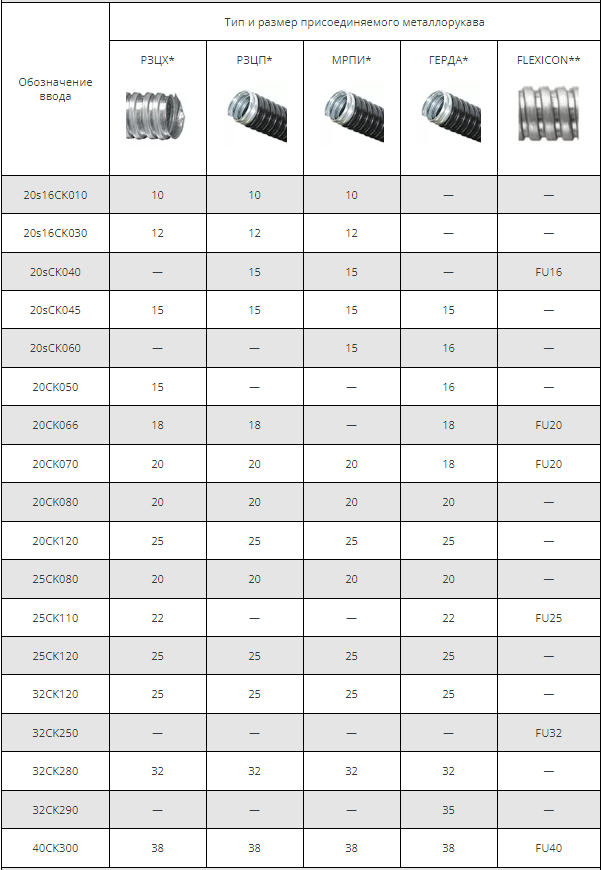Таблица подбора кабельного ввода серии СК по металлорукаву