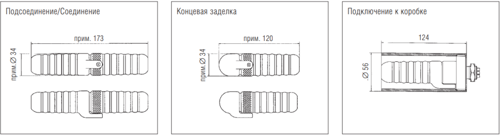 Благодаря гибкости системы возможно как прямое соединение греющего кабеля с подсоединительным (питающим) кабелем, так и подключение к взрывозащищенной клеммной коробке. Для армированного кабеля имеется специальная соединительная муфта. Два одинаковых греющих кабеля также могут быть соединены штепсельным разъемом через соответствующую соединительную муфту. Концевая заделка греющего кабеля по желанию Заказчика может быть снабжена штепсельными разъемами, что впоследствии поможет при необходимости удлинения обогревательного контура.