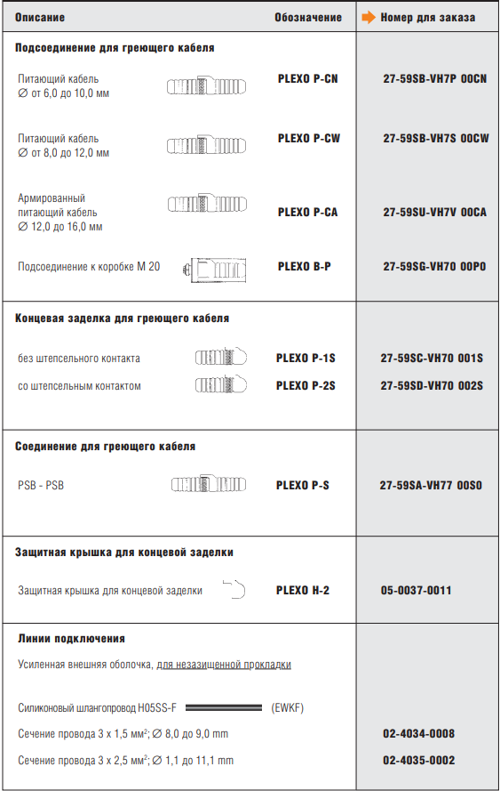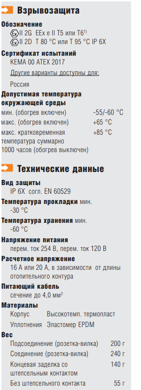 Благодаря гибкости системы возможно как прямое соединение греющего кабеля с подсоединительным (питающим) кабелем, так и подключение к взрывозащищенной клеммной коробке. Для армированного кабеля имеется специальная соединительная муфта. Два одинаковых греющих кабеля также могут быть соединены штепсельным разъемом через соответствующую соединительную муфту. Концевая заделка греющего кабеля по желанию Заказчика может быть снабжена штепсельными разъемами, что впоследствии поможет при необходимости удлинения обогревательного контура.
