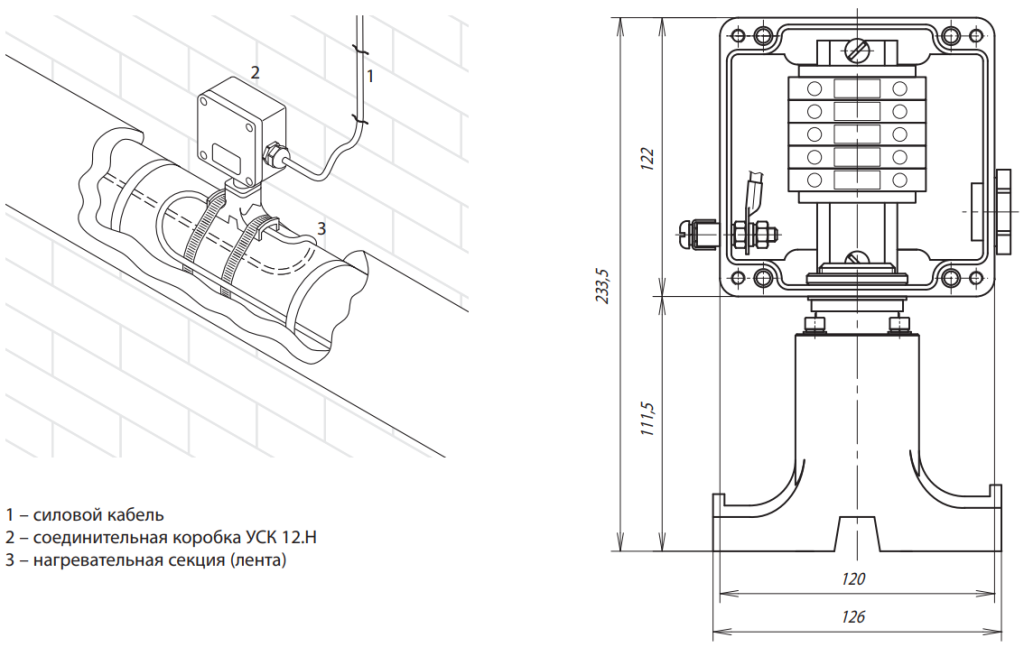 Коробка УСК 12.Н предназначена для подключения к силовой сети саморегулирующихся электрических нагревательных лент. Коробка крепится непосредственно на трубопроводе. Коробка позволяет выполнить подключение до 2 ниток* саморегулирующихся электрических нагревательных лент к силовому кабелю и подключение до 3 ниток* для разветвления. Конструкция корпуса обеспечивает за щиту от проникновения влаги и пыли IP66 и высокую коррозионную стойкость. Применяемые клеммные наборы позволяют обеспечить подключение многожильных или одножильных проводов сечением от 1,5 до 10 мм².