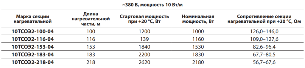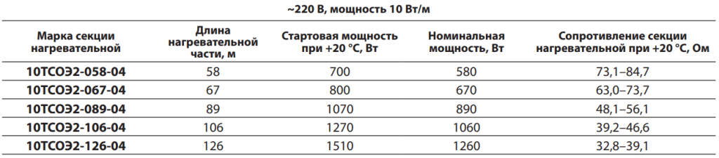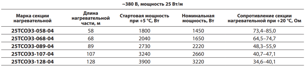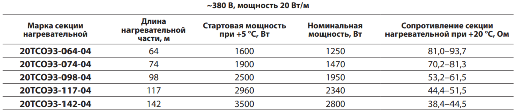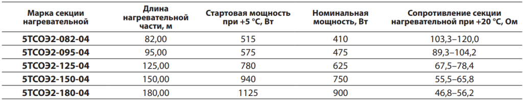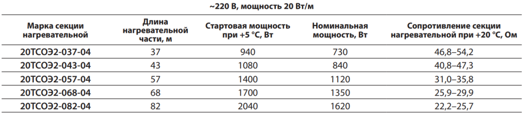 Параметры стандартных секций нагревательных ТСОЭ для систем обогрева кровли: 20ТСОЭ2-082-04