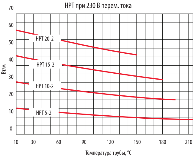 Представленная на диаграмме выходная мощность относится к кабелю с оболочкой, установленному на изолированной металлической трубе при рабочем напряжении, указанном ниже.