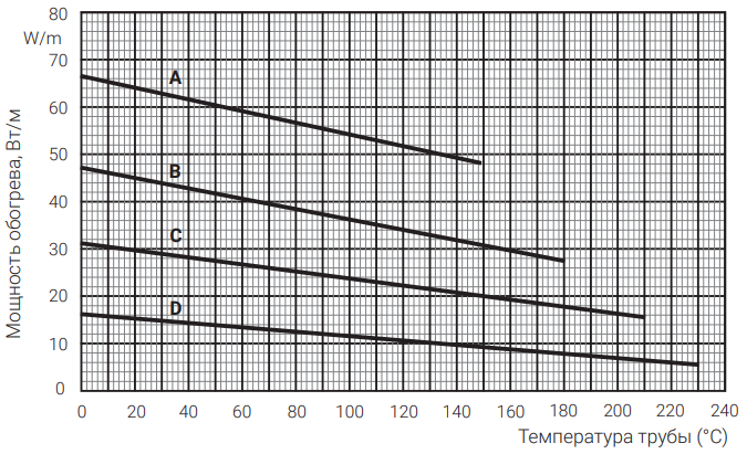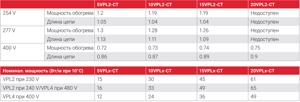 Номинальная мощность обогрева при напряжении 230 В и 480 В на теплоизолированных стальных трубах (мощность обогрева кабелей VPL4 при 400 В будет ниже) Для выбора греющего кабеля, наиболее полно соответствующего Вашим нуждам, используйте разработанную nVent программу TraceCalc.