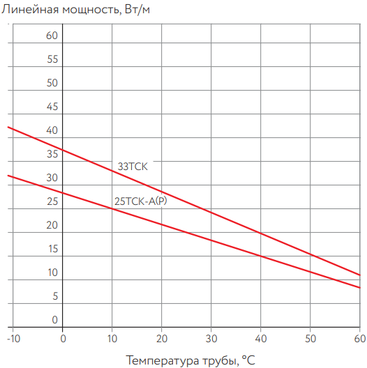 Номинальное тепловыделение для саморегулирующихся нагревательных кабелей при рабочем напряжении 230 В:
