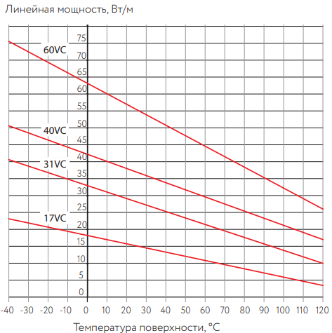 Номинальная мощность для саморегулирующихся нагревательных кабелей при рабочем напряжении 230 В: