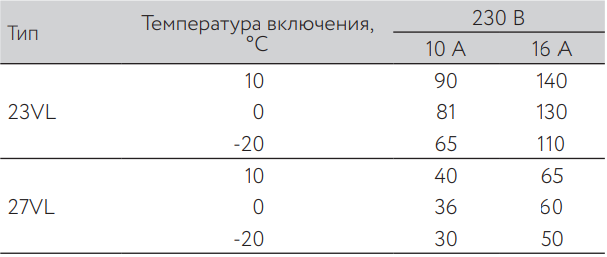 (или суммарная длина секции одной марки, подключаемой параллельно) в зависимости от типа автоматического выключателя питания:
