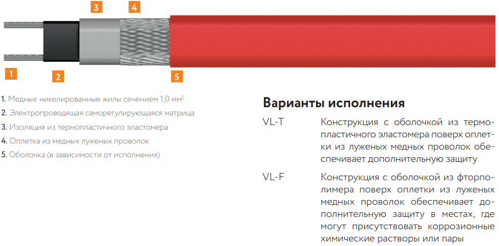 Характеристики саморегулирования повышают безопасность и надежность кабеля. VL не будет перегреваться или перегорать, даже когда его отдельные участки накладываются друг на друга. Его тепловыделение саморегулируется в ответ на изменение температуры. Установка нагревательного кабеля VL проста, занимает мало времени и не требует никаких специальных навыков или инструментов. Все компоненты для заделки концов, соединения и подключения питания имеются в удобных наборах.