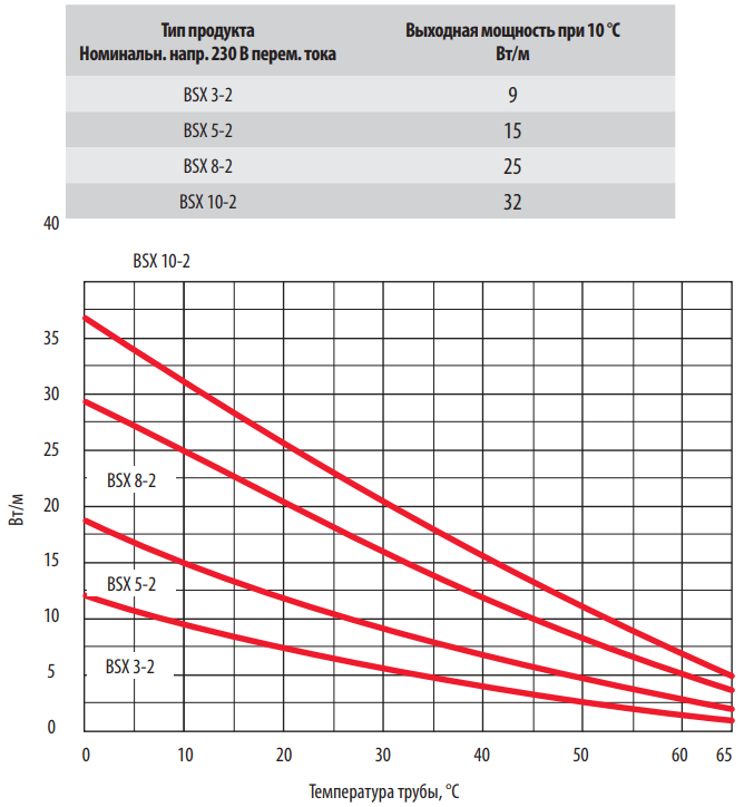 Выходная мощность кабеля BSX варьируется в зависимости от окружающих условий на протяжении всей длины цепи. Всякий раз, когда теплопотери изолированных труб, резервуаров или оборудования возрастают (по мере понижения температуры окружающей среды), повышается выходная мощность кабеля. И наоборот, если теплопотери уменьшаются (по мере повышения температуры окружающей среды или прохождения продукта), выходная мощность кабеля понижается. Такое саморегулирование позволяет осуществлять монтаж кабеля BSX внахлест, не подвергая его риску повреждения при нарушении температурного режима.