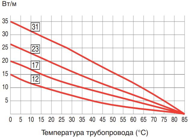 Номинальная выходная мощность кабеля FSLe при питании 230В, когда он установлен на изолированных металлических трубах.