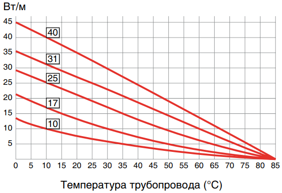 Номинальная выходная мощность кабеля FSR при питании 230В, когда он установлен на изолированных металлических трубах.
