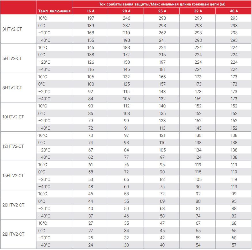 Макс. длина цепи обогрева при использовании автоматического выключателя типа "C" согласно EN 60898 Raychem 10HTV2-CT-T3