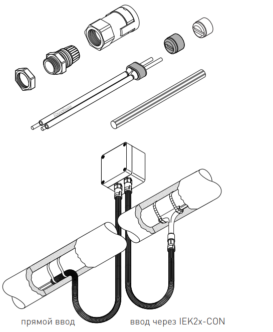 Кабелепровод дает дополнительную механическую защиту греющего кабеля или холодного ввода между соединительной коробкой и местом ввода под теплоизоляцию. Подсоединение к кабелепроводу быстрое и надежное и обеспечивает, несмотря на простоту монтажа, степень защиты оболочки IP66. Набор может использоваться с различными типами кабелепроводов, нарезаемых на участки необходимой длины на месте при монтаже. Изолирующая манжета для жил греющего кабеля не требует применения фена горячего воздуха или горелки для его монтажа (не требуется разрешение на производство огневых работ). Неотверждаемый герметик (не содержащий силикона) и облегчает обслуживание. Кабелепровод и набор для прохода через теплоизоляцию не входят в комплект и заказываются отдельно.