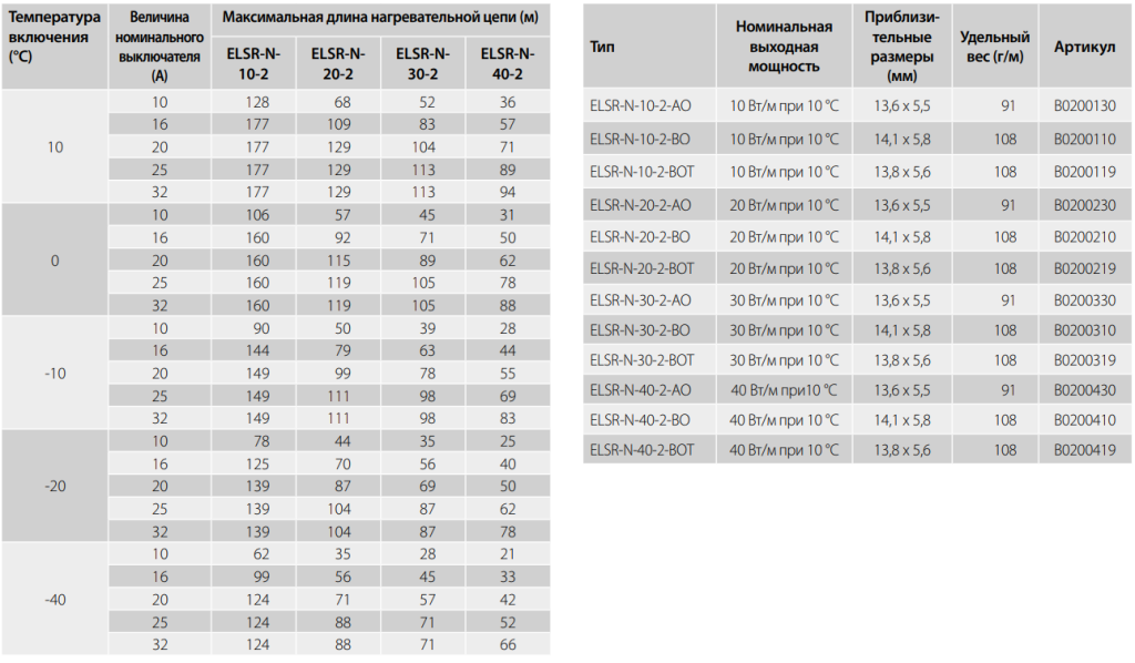 Длины нагревательной цепи ELSR-N-…-2 c учетом следующих положений:
