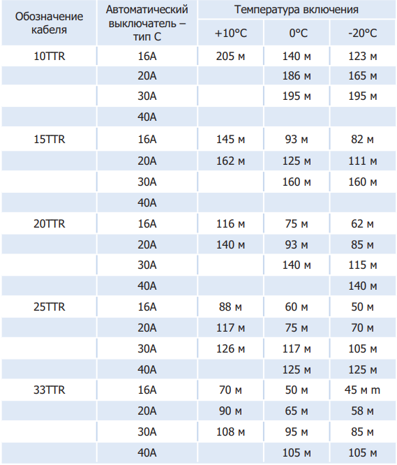 Максимальная рекомендуемая длина нагревательного кабеля при напряжении сети 230 В 33TTR-2-BO