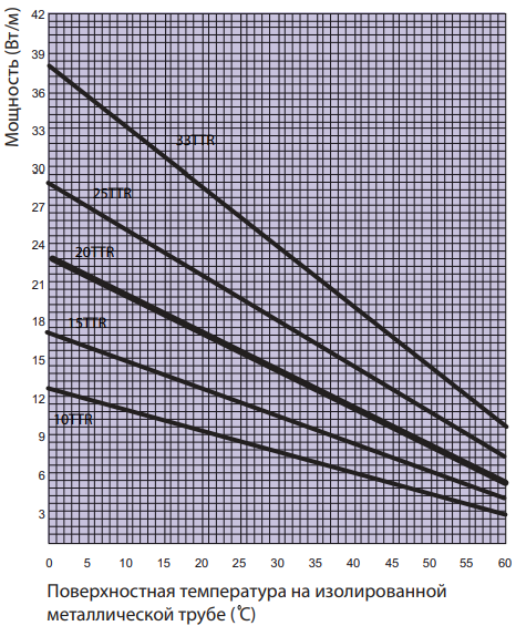 График зависимости удельной мощности кабеля от температуры 33TTR-2-BO