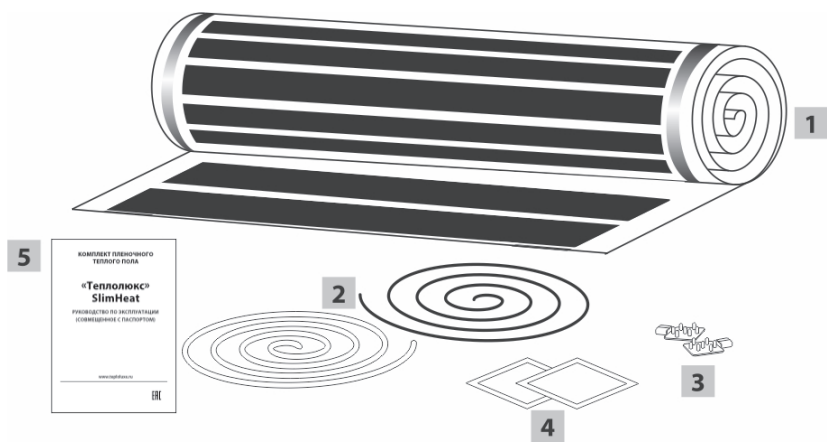 В состав комплекта пленочного теплого пола «Теплолюкс» SlimHeat входят:- Нагревательная пленка