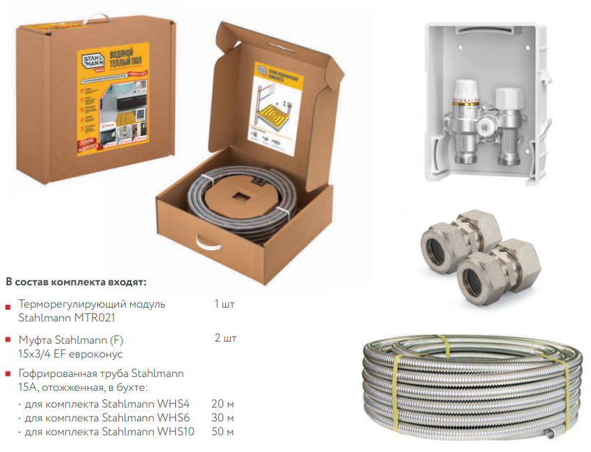 Готовые комплекты водяных теплых полов Stahlmann WHS10 специально разработаны инженерами ГК «ССТ» для установки в помещениях площадью до 10 квадратных метров в коттеджах, таунхаусах, гостиницах.