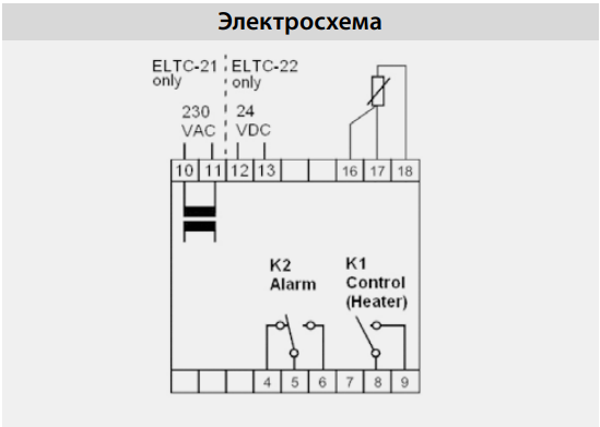 ELTC-22 электронный температурный регулятор с цифровым дисплеем для стандартного монтажа на рейке. Температура измеряется при помощи датчика Pt100, обрабатывается микрорегулятором и выводится на дисплей. После оценки фактических и заданных величин в зависимости от конфигурации включаются соответствующие выводы реле