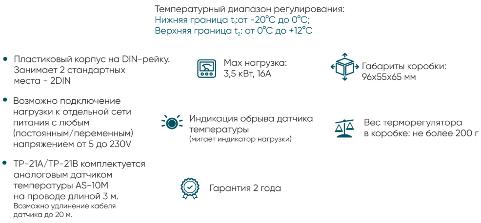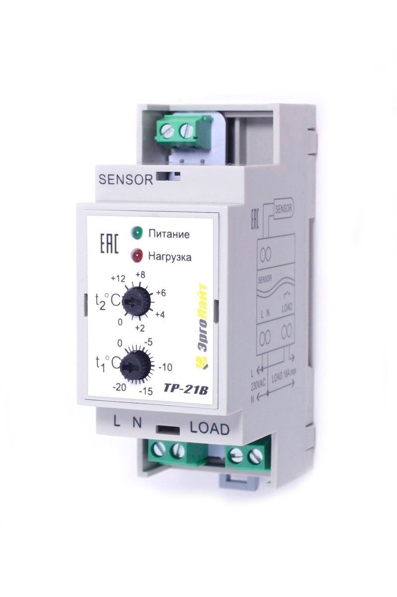 ТР-21В измеряет уличную температуру и при попадании уличной температуры в заданный t1 и t2 диапазон подает питание на другой терморегулятор (с литерой А на конце, например ТР-22А или ТР-42А). Датчик температуры второго терморегулятора устанавливается на обогреваемый объект. Второй терморегулятор (ТР-22А или ТР-42А) поддерживает заданную температуру обогреваемого объекта.
