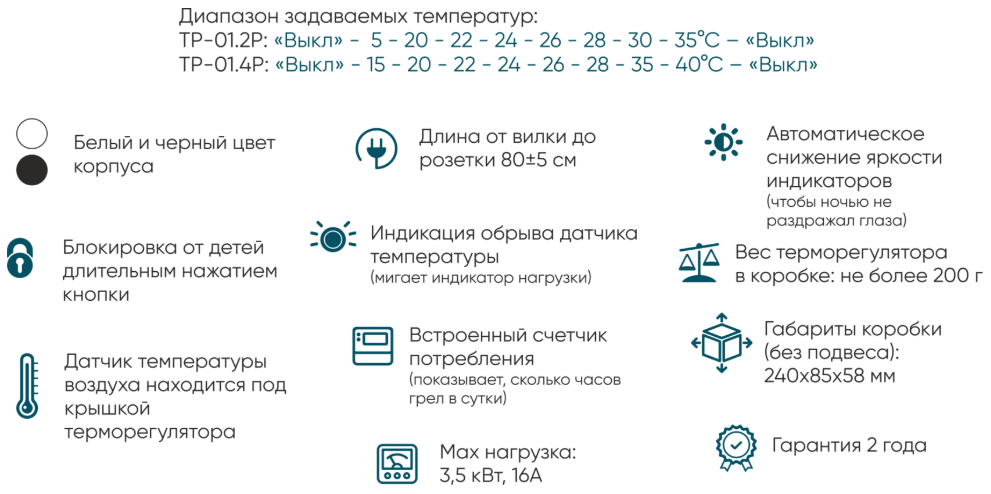 В терморегуляторе встроен датчик температуры воздуха. Терморегулятор включается между обогревателем и розеткой питания. Пока воздух в помещении ниже заданной на терморегуляторе, терморегулятор держит обогреватель включенным. Когда воздух в помещении прогреется до заданной, терморегулятор выключит нагрев. В результате обогреватель не будет перегревать помещение и будет реже включаться, экономя электроэнергию.
