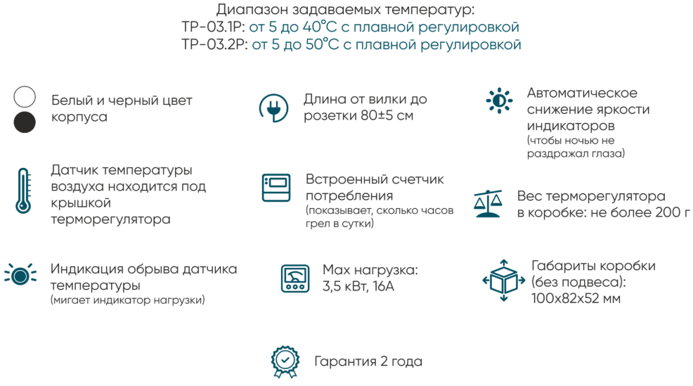 В терморегуляторе встроен датчик температуры воздуха. Терморегулятор включается между обогревателем и розеткой питания. Пока воздух в помещении ниже заданной на терморегуляторе, терморегулятор держит обогреватель включенным. Когда воздух в помещении прогреется до заданной, терморегулятор выключит нагрев. В результате обогреватель не будет перегревать помещение и будет реже включаться, экономя электроэнергию.