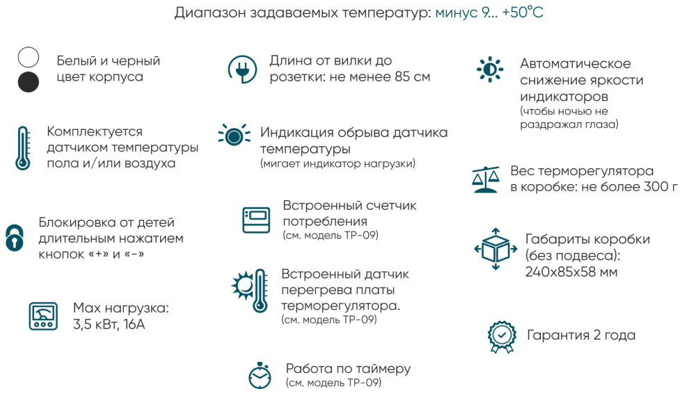 - Терморегулятор работает с любыми напольными и настенными электрическими обогревателями: