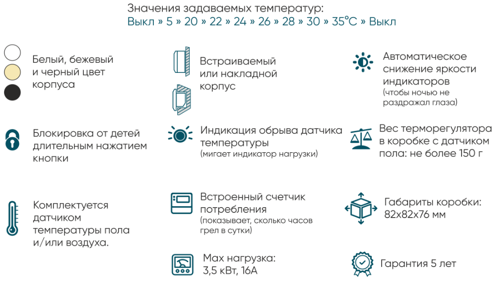 - Значения задаваемых температур: 5 - 20 - 22 - 24 - 26 - 28 - 30 - 35°С;